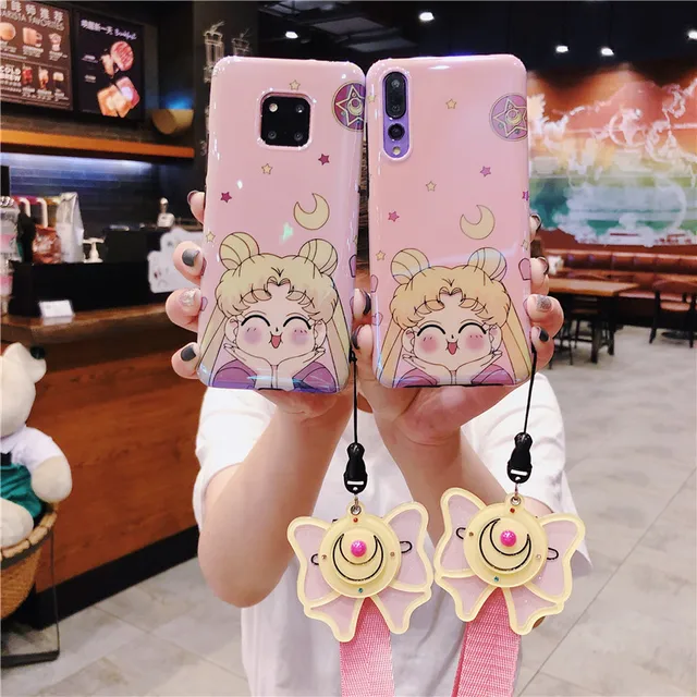 Special Price For Huawei P20 pro/ P30 pro case pink Sailor Moon phone cover honor 9/10 + make-up mirror strap Mate 10/20 pro girl gift Nova3/4